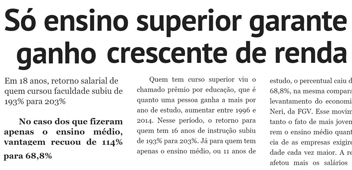 O mesmo raciocínio vale para o estudo e lembrei disso quando vi o resultado de uma pesquisa afirmando que só o ensino superior garante o ganho crescente de renda. Sempre que tenho oportunidade incentivo os jovens e insisto com eles sobre a importância do estudo para conquistar vidas melhores, mas nem sempre sou bem compreendido e até já ouvi como resposta 'Dinheiro não traz felicidade'. Sim, isto é a pura verdade, mas quem falou em dinheiro?