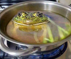 Conta-se que se colocarmos um sapo numa panela com água à temperatura ambiente e fizermos a temperatura aumentar aos poucos, o sapo não sentirá a mudança na temperatura até ser tarde demais e acabará cozinhado.